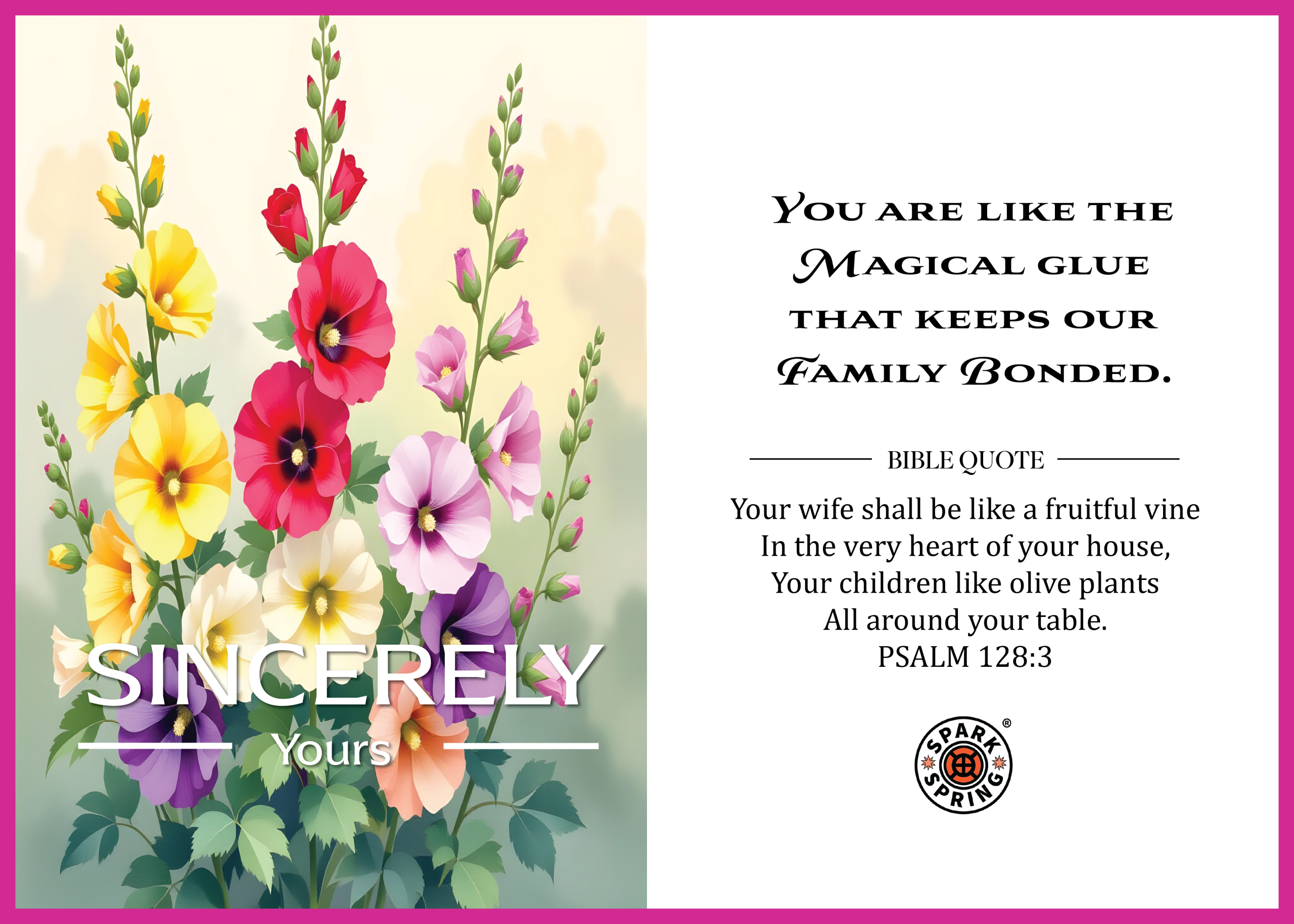 Express timeless love with the Sincerely Yours Virtual e-Card by Spark + Spring® | It Rhymes With Greetings™. Perfect for everyday romance and Valentine’s Day, this elegant digital card features a contemporary message layered with a Christian-inspired spiritual undertone, including a meaningful Bible verse from Psalm 128:3. $1.99 -
