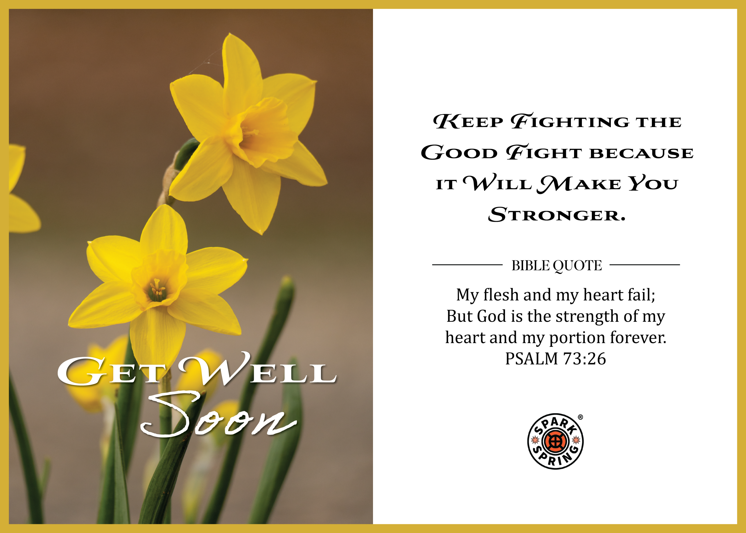 Beautifully designed with uplifting yellow blooms, this digital greeting card blends a contemporary message of strength and perseverance with a Christian-inspired spiritual undertone, making it especially meaningful for a Christian friend or loved one. The message, “Keep fighting the good fight because it will make you stronger,” is paired with a comforting Bible verse from Psalm 73:26, reminding the recipient that even in weakness, God remains their eternal strength and portion.