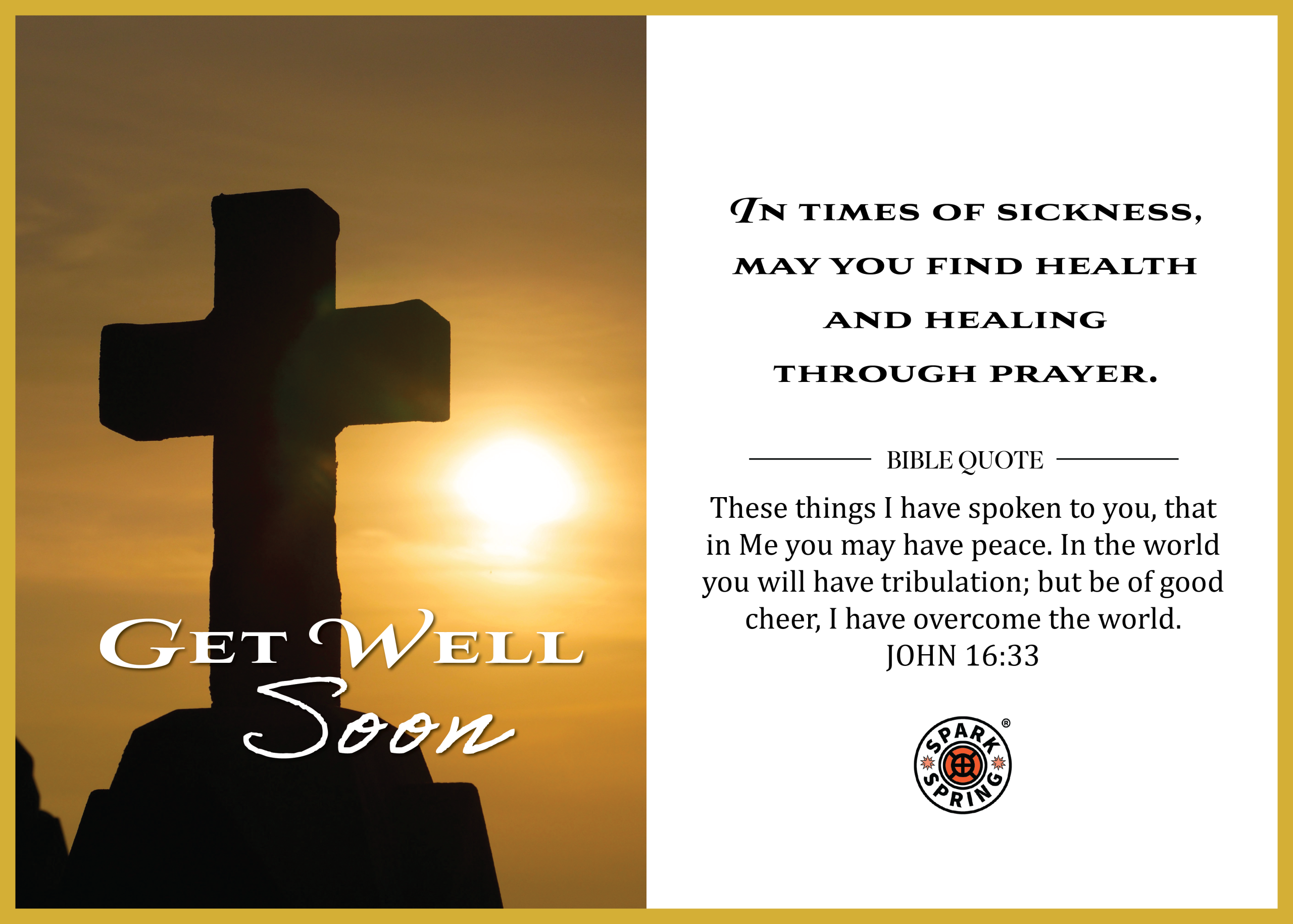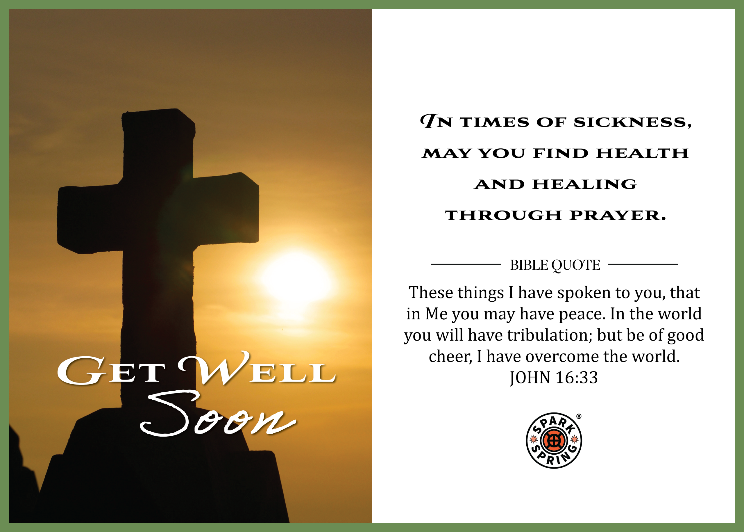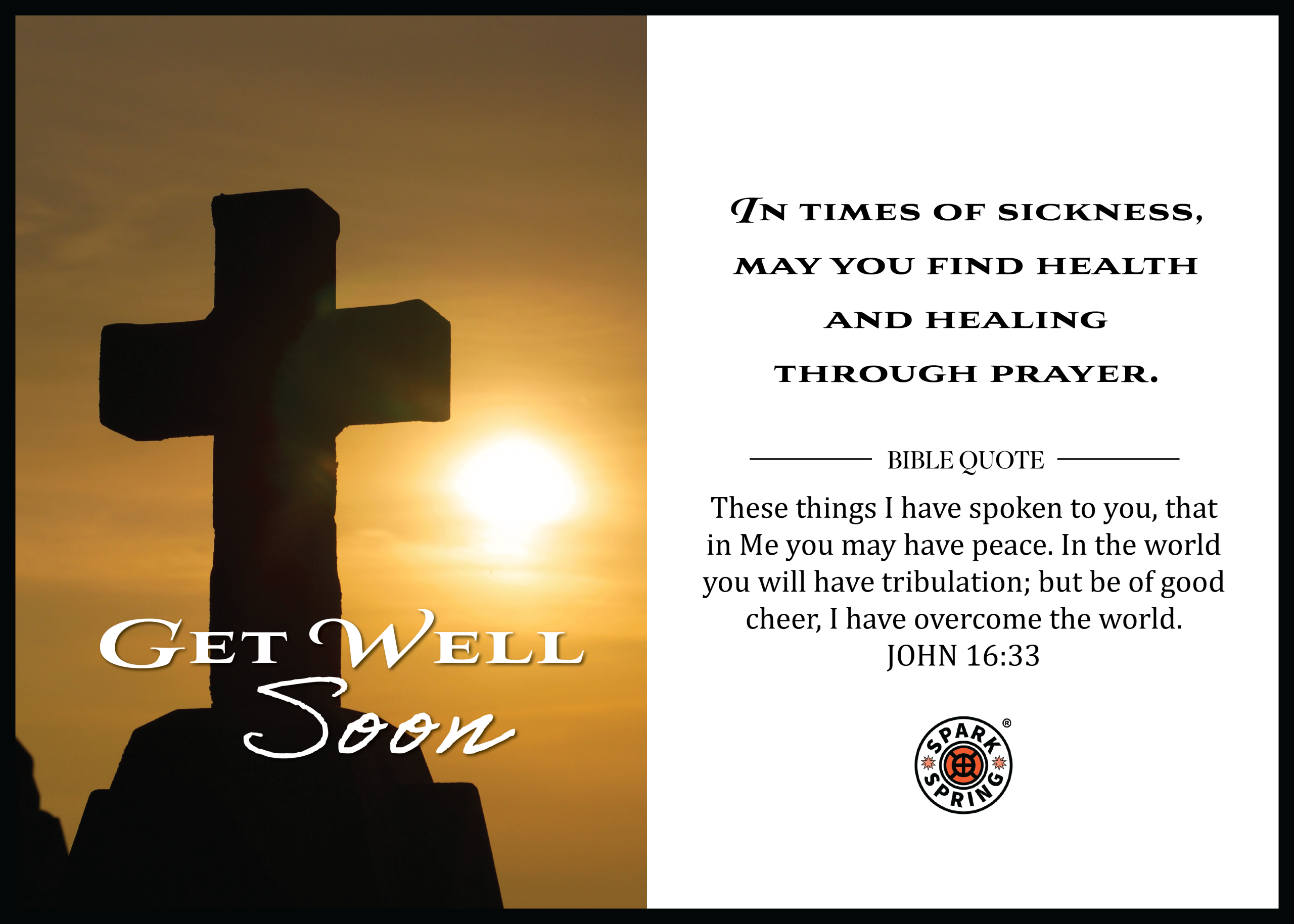 Send comfort and faith-filled encouragement with this Get Well Soon Virtual Greeting e-Card by Spark + Spring®. Featuring a contemporary message paired with a powerful Bible verse (John 16:33), this Christian-inspired design offers hope and healing through prayer for your Christian friend or loved one. Eco-friendly, instantly delivered, and extremely affordable, each purchase also supports charitable causes. Thoughtfully created by Spark + Spring® Greetings, Say It Like You Mean It™—your official source for heartfelt, everyday greeting cards.